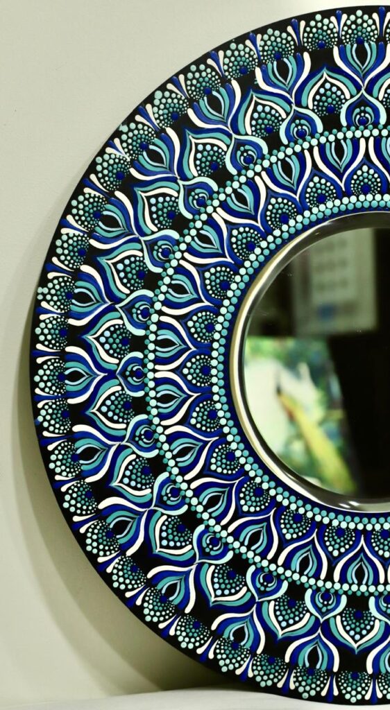 “This intricate mandala mirror radiates harmony and balance through vibrant, hand-painted patterns. The rhythmic flow of petals and dots symbolizes growth, abundance, and inner light. A soulful blend of art and reflection, it transforms any space into a sanctuary of beauty.”