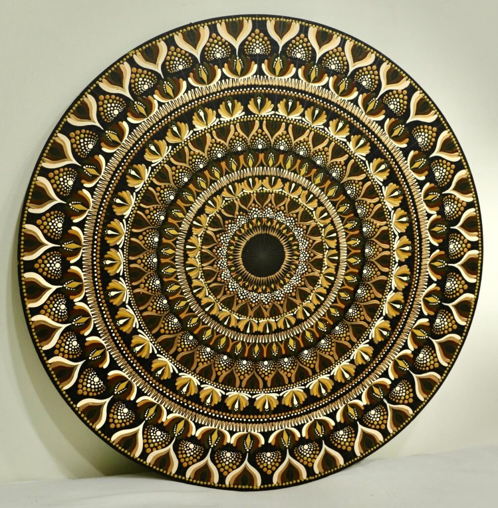 Radiating warmth in gold, amber, and ivory, this mandala forms a sacred ring of balance—symbolizing unity, abundance, and the eternal flow of life’s blessings.